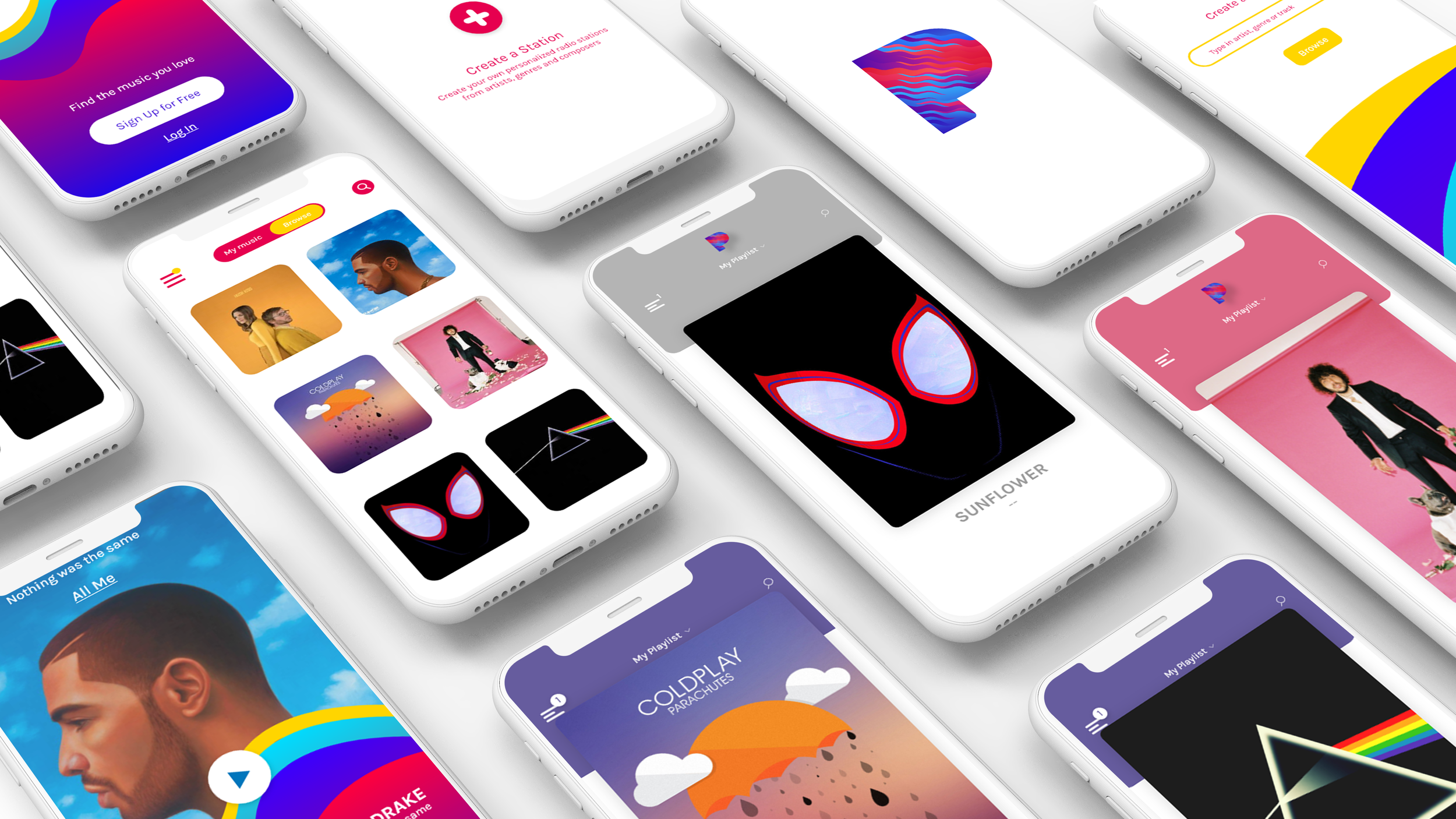 Pandora - This project is a visual representation of the Pandora music app. The visuals are illustrated by following the color scheme and changing the content hierarchy. I have used original pandora color scheme, experimented with typography and illustrations.